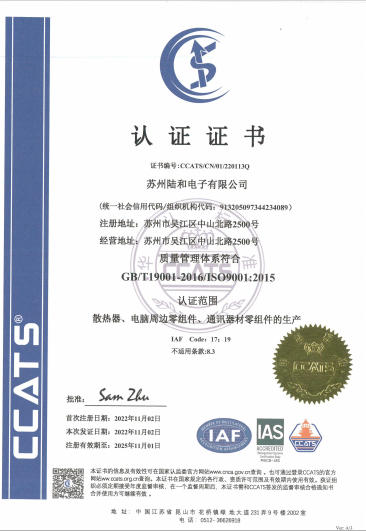| ISO 9001:2015 | 質量管理體系 | CCATS/CN/01/220113Q |