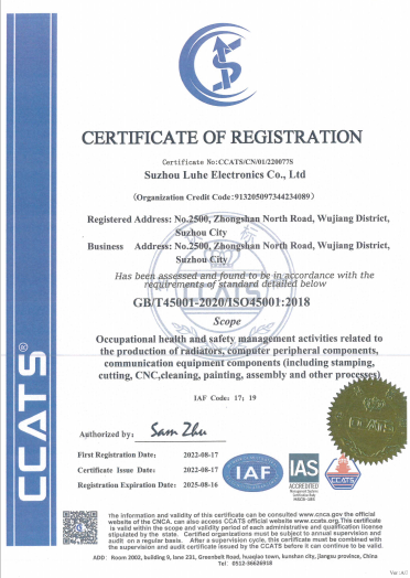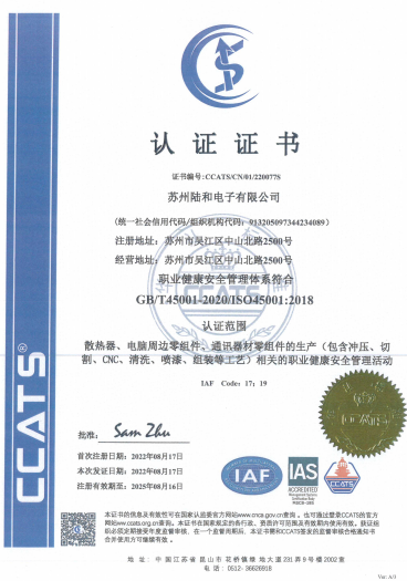 | ISO 45001:2018 | 職業健康安全管理體系 | CCATS/CN/01/220077S |